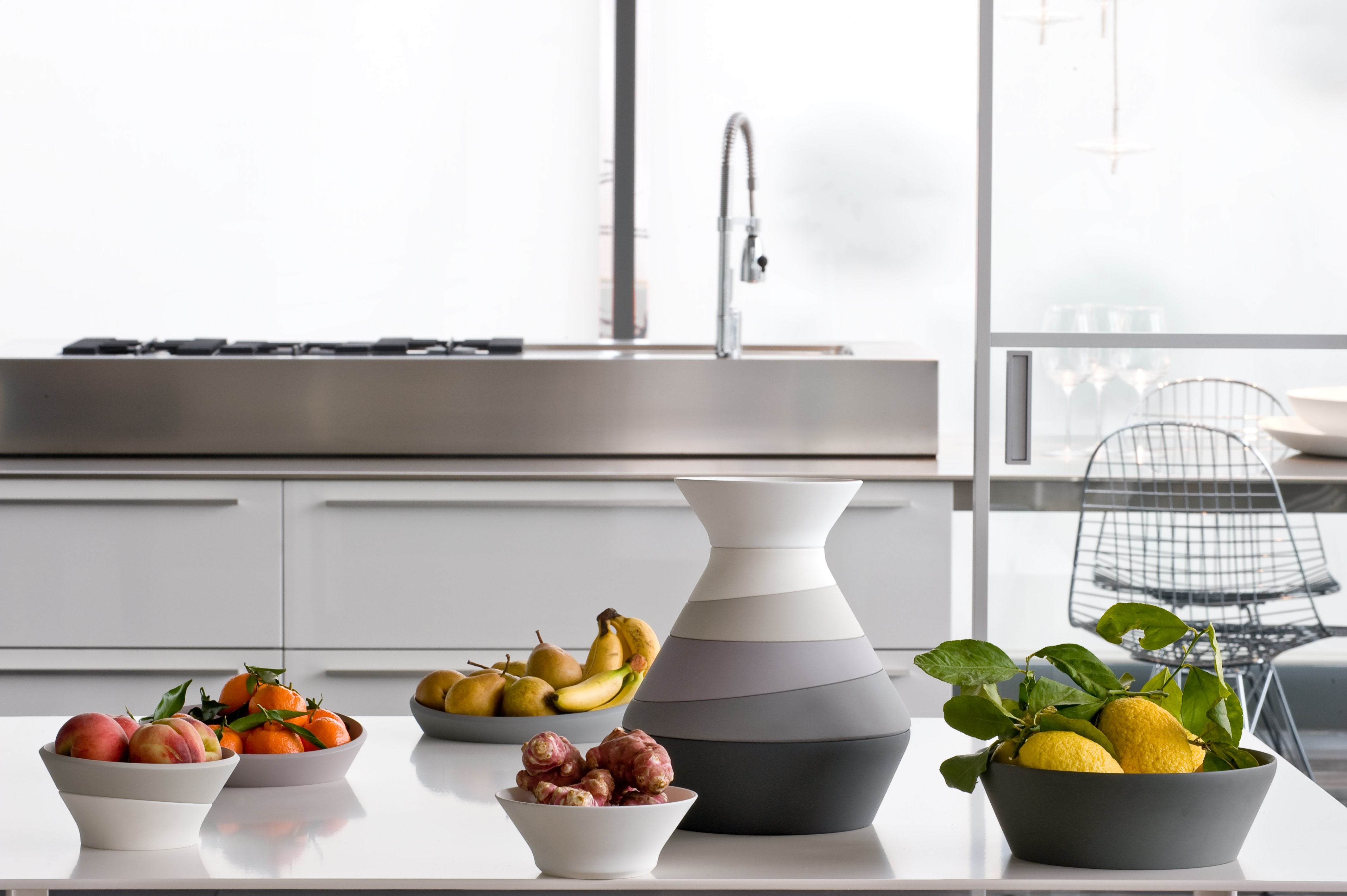 The containers are made of thermosetting material, certified for contact with foodstuffs and are dishwasher safe. They are available in six different shades: from dark grey for the larger element to pure white for the smallest.